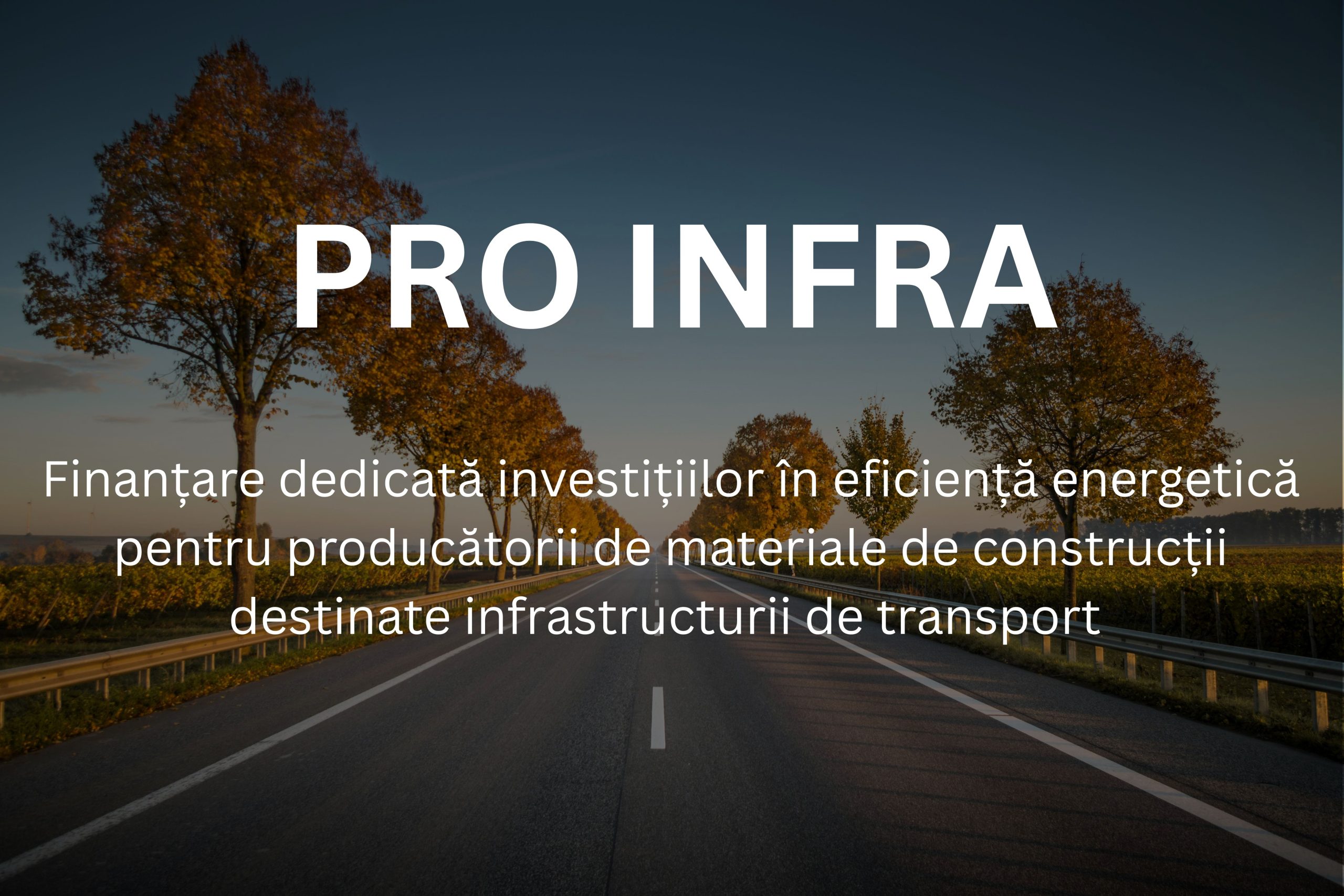 PRO INFRA este o schemă de ajutor de stat finanțată din Fondul pentru Modernizare, dedicată investițiilor în eficiență energetică pentru producătorii de materiale de construcții destinate infrastructurii de transport. Programul vizează microîntreprinderi, IMM-uri și întreprinderi mari.